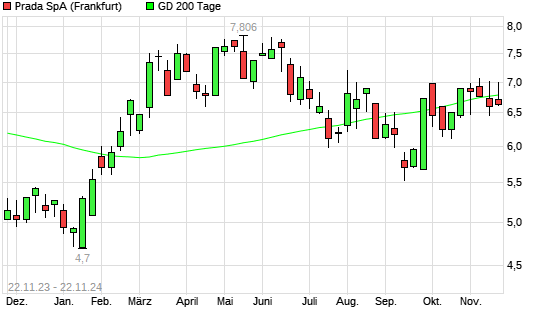 Mit dem Anstieg auf 6,99 EUR hat die Prada-Aktie am 21.11.2024 die 200-Tage-Linie nach oben gekreuzt.
