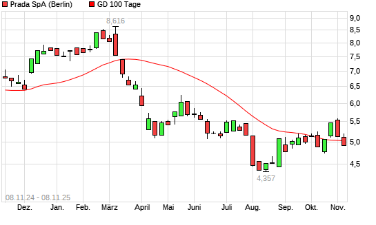 Mit dem Rücksetzer auf 4,99 EUR hat die Prada-Aktie am 07.11.2025 die 100-Tage-Linie nach unten gekreuzt.
