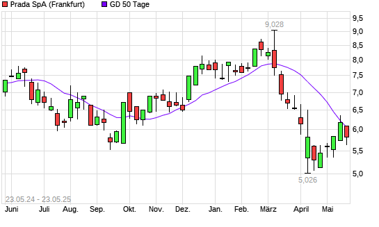 Mit dem Rücksetzer auf 5,80 EUR hat die Prada-Aktie am 22.05.2025 die 50-Tage-Linie nach unten gekreuzt.