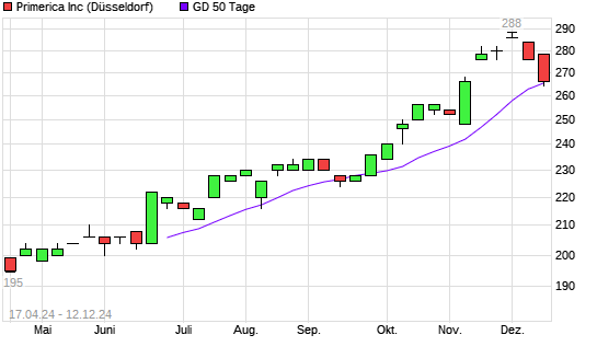 Mit dem Rücksetzer auf 266,00 EUR hat die Primerica-Aktie am 11.12.2024 die 50-Tage-Linie nach unten gekreuzt.