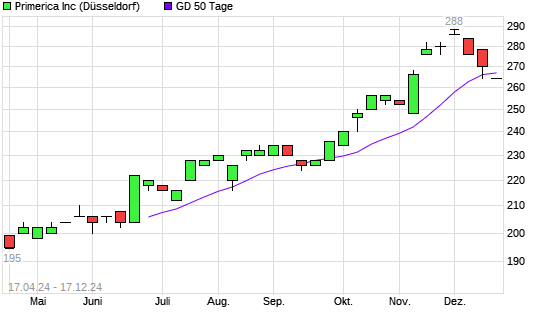Mit dem Rücksetzer auf 266,00 EUR hat die Primerica-Aktie am 16.12.2024 die 50-Tage-Linie nach unten gekreuzt.