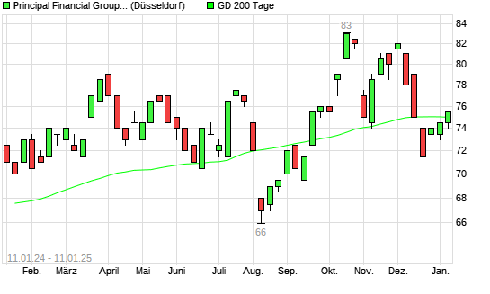 Mit dem Rücksetzer auf 75,00 EUR hat die Principal Financial-Aktie am 10.01.2025 die 200-Tage-Linie nach unten gekreuzt.