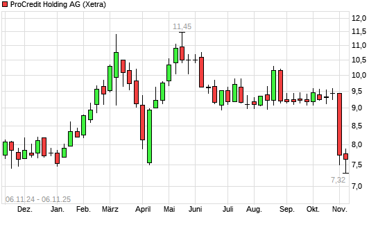 Mit dem Rücksetzer auf 7,44 EUR hat die ProCredit Holding-Aktie (ISIN DE0006223407) am 05.11.2025 ein neues 12-Monats-Tief erreicht und damit den Kurs vom 04.11.2025 eingestellt.