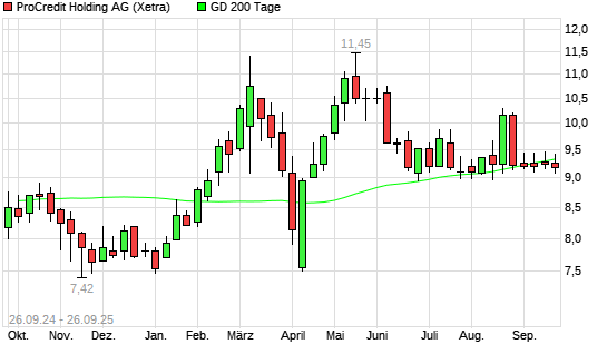 Mit dem Rücksetzer auf 9,22 EUR hat die ProCredit Holding-Aktie am 25.09.2025 die 200-Tage-Linie nach unten gekreuzt.