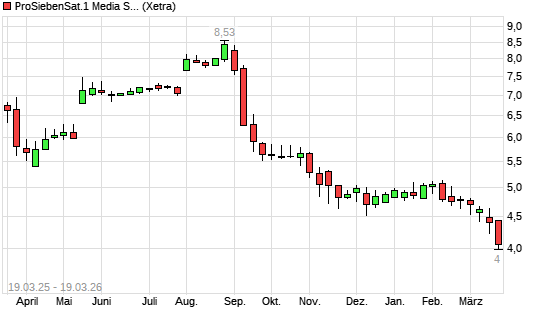 Mit dem Rücksetzer auf 4,14 EUR hat die ProSiebenSat.1-Aktie (ISIN DE000PSM7770) am 18.03.2026 ein neues 10-Jahres-Tief erreicht und damit den Kurs vom 17.03.2026 eingestellt.
