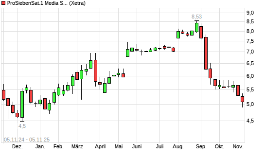Mit dem Rücksetzer auf 5,05 EUR hat die ProSiebenSat.1-Aktie (ISIN DE000PSM7770) am 04.11.2025 ein neues 6-Monats-Tief erreicht und damit den Kurs vom 03.11.2025 eingestellt.