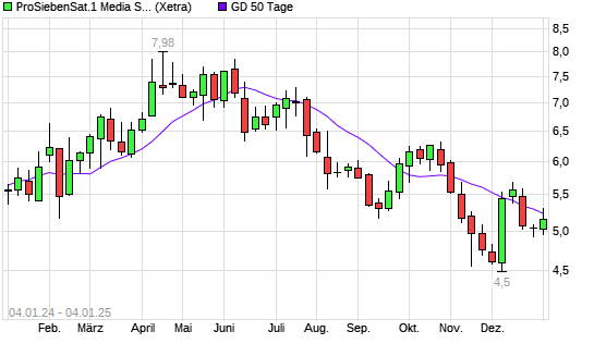 Mit dem Rücksetzer auf 5,12 EUR hat die ProSiebenSat.1-Aktie am 03.01.2025 die 50-Tage-Linie nach unten gekreuzt.