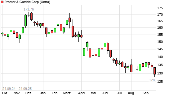 Mit dem Rücksetzer auf 128,74 EUR hat die Procter & Gamble-Aktie (ISIN US7427181091) am 23.09.2025 ein neues 12-Monats-Tief erreicht und damit den Kurs vom 22.09.2025 eingestellt.