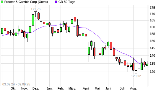 Mit dem Anstieg auf 135,64 EUR hat die Procter & Gamble-Aktie am 02.09.2025 die 50-Tage-Linie nach oben gekreuzt.