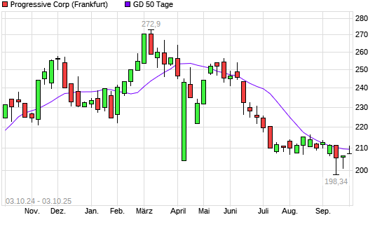 Mit dem Rücksetzer auf 207,75 EUR hat die Progressive-Aktie am 02.10.2025 die 50-Tage-Linie nach unten gekreuzt.