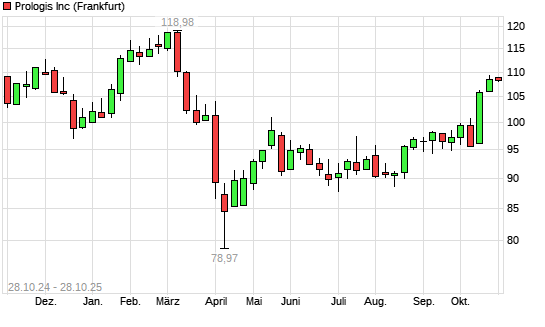 Mit dem Anstieg auf 108,94 EUR hat die Prologis-Aktie (ISIN US74340W1036) am 27.10.2025 ein neues 6-Monats-Hoch erreicht und damit den Kurs vom 21.10.2025 eingestellt.