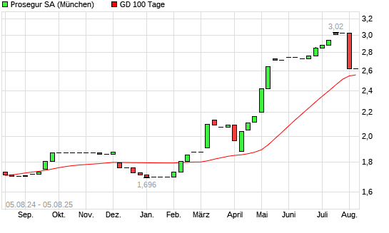 Mit dem Rücksetzer auf 2,55 EUR hat die Prosegur-Aktie am 04.08.2025 die 100-Tage-Linie nach unten gekreuzt.