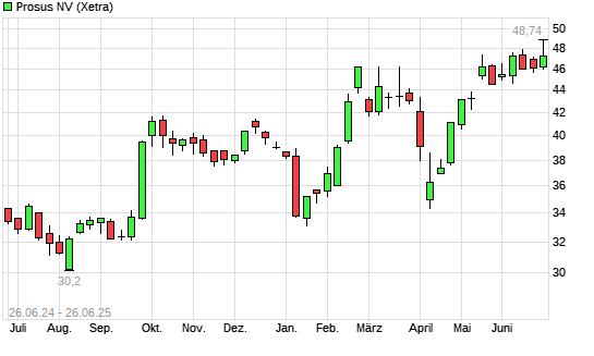 Mit dem Anstieg auf 48,38 EUR hat die Prosus-Aktie (ISIN NL0013654783) am 25.06.2025 ein neues 3-Jahres-Hoch erreicht und damit den Kurs vom 24.06.2025 eingestellt.