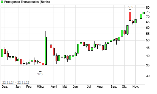 Mit dem Anstieg auf 75,00 EUR hat die Protagonist Therapeutics-Aktie (ISIN US74366E1029) am 21.11.2025 ein neues All-Time-High erreicht und damit den Kurs vom 19.11.2025 eingestellt.