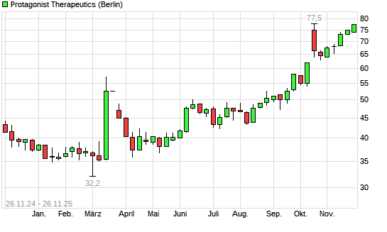 Mit dem Anstieg auf 76,50 EUR hat die Protagonist Therapeutics-Aktie (ISIN US74366E1029) am 25.11.2025 ein neues All-Time-High erreicht und damit den Kurs vom 24.11.2025 eingestellt.