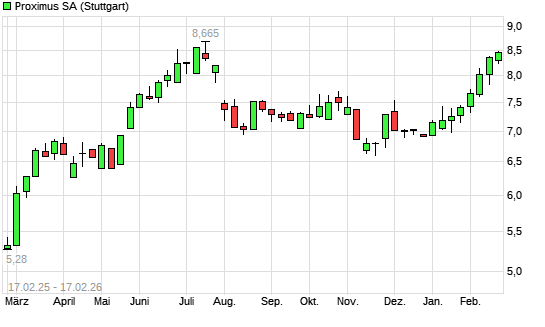Mit dem Anstieg auf 8,42 EUR hat die Proximus-Aktie (ISIN BE0003810273) am 16.02.2026 ein neues 6-Monats-Hoch erreicht und damit den Kurs vom 12.02.2026 eingestellt.