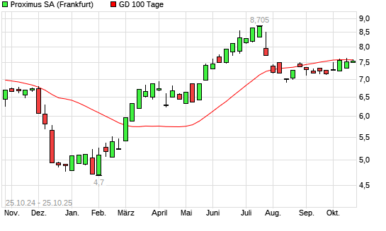 Mit dem Rücksetzer auf 7,55 EUR hat die Proximus-Aktie am 24.10.2025 die 100-Tage-Linie nach unten gekreuzt.