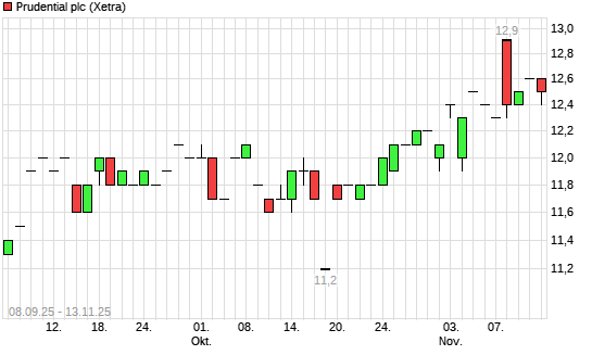 Mit dem Anstieg auf 12,50 EUR hat die Prudential-Aktie (ISIN GB0007099541) am 12.11.2025 ein neues 12-Monats-Hoch erreicht und damit den Kurs vom 03.11.2025 eingestellt.