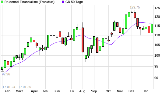 Mit dem Rücksetzer auf 114,90 EUR hat die Prudential Financial-Aktie am 16.01.2025 die 50-Tage-Linie nach unten gekreuzt.