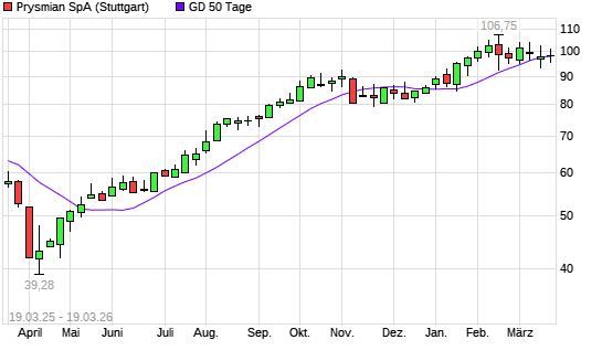 Mit dem Anstieg auf 98,00 EUR hat die Prysmian-Aktie am 18.03.2026 die 50-Tage-Linie nach oben gekreuzt.