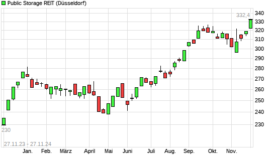 Mit dem Anstieg auf 329,20 EUR hat die Public Storage-Aktie (ISIN US74460D1090) am 26.11.2024 ein neues 12-Monats-Hoch erreicht und damit den Kurs vom 24.09.2024 eingestellt.
