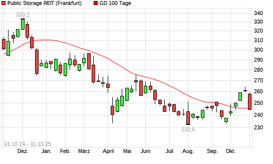 Mit dem Rücksetzer auf 244,40 EUR hat die Public Storage-Aktie am 30.10.2025 die 100-Tage-Linie nach unten gekreuzt.