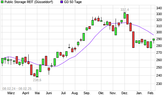 Mit dem Rücksetzer auf 290,70 EUR hat die Public Storage-Aktie am 07.02.2025 die 50-Tage-Linie nach unten gekreuzt.