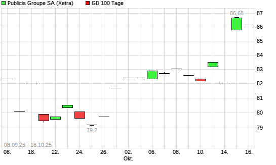 Mit dem Anstieg auf 86,30 EUR hat die Publicis Groupe-Aktie am 16.10.2025 die 100-Tage-Linie nach oben gekreuzt.