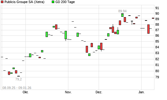 Mit dem Rücksetzer auf 86,32 EUR hat die Publicis Groupe-Aktie am 08.01.2026 die 200-Tage-Linie nach unten gekreuzt.