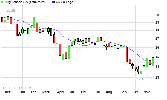 Mit dem Anstieg auf 14,41 EUR hat die Puig Brands-Aktie am 11.11.2025 die 50-Tage-Linie nach oben gekreuzt.