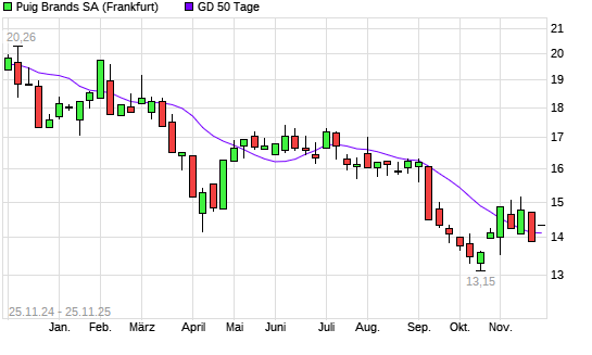 Mit dem Anstieg auf 14,34 EUR hat die Puig Brands-Aktie am 24.11.2025 die 50-Tage-Linie nach oben gekreuzt.