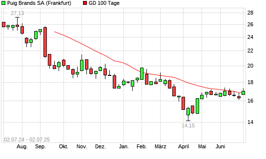 Mit dem Rücksetzer auf 16,70 EUR hat die Puig Brands-Aktie am 01.07.2025 die 100-Tage-Linie nach unten gekreuzt.