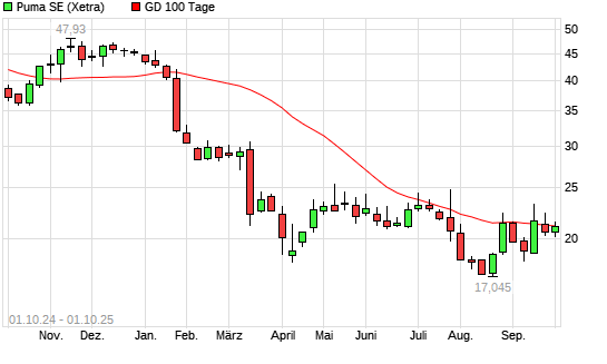Mit dem Anstieg auf 21,25 EUR hat die Puma-Aktie am 30.09.2025 die 100-Tage-Linie nach oben gekreuzt.