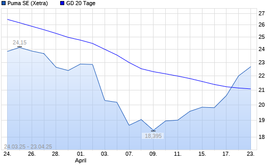 Mit dem Anstieg auf 22,11 EUR hat die Puma-Aktie am 22.04.2025 die 20-Tage-Linie nach oben gekreuzt.