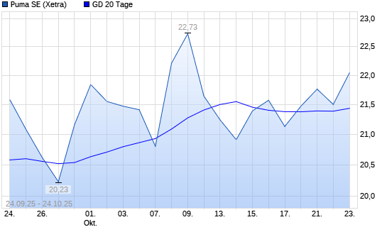 Mit dem Anstieg auf 21,90 EUR hat die Puma-Aktie am 23.10.2025 die 20-Tage-Linie nach oben gekreuzt.