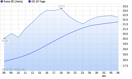 Mit dem Rücksetzer auf 21,74 EUR hat die Puma-Aktie am 05.01.2026 die 20-Tage-Linie nach unten gekreuzt.