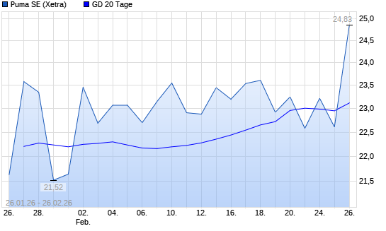Mit dem Rücksetzer auf 22,88 EUR hat die Puma-Aktie am 25.02.2026 die 20-Tage-Linie nach unten gekreuzt.