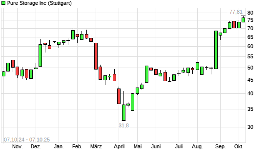 Mit dem Anstieg auf 77,30 EUR hat die Pure Storage-Aktie (ISIN US74624M1027) am 06.10.2025 ein neues All-Time-High erreicht und damit den Kurs vom 03.10.2025 eingestellt.