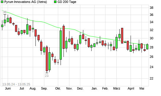 Mit dem Anstieg auf 28,00 EUR hat die Pyrum Innovations-Aktie am 12.05.2025 die 200-Tage-Linie nach oben gekreuzt.