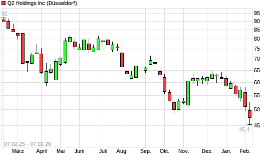Mit dem Rücksetzer auf 45,60 EUR hat die Q2 Holding-Aktie (ISIN US74736L1098) am 06.02.2026 ein neues 12-Monats-Tief erreicht und damit den Kurs vom 04.02.2026 eingestellt.