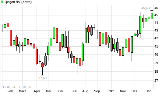 Mit dem Anstieg auf 44,15 EUR hat die Qiagen-Aktie (ISIN NL0015001WM6) am 10.01.2025 ein neues 12-Monats-Hoch erreicht und damit den Kurs vom 08.01.2025 eingestellt.