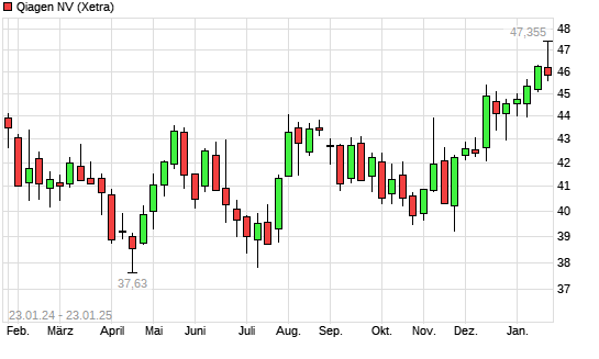 Mit dem Anstieg auf 46,21 EUR hat die Qiagen-Aktie (ISIN NL0015001WM6) am 22.01.2025 ein neues 12-Monats-Hoch erreicht und damit den Kurs vom 21.01.2025 eingestellt.