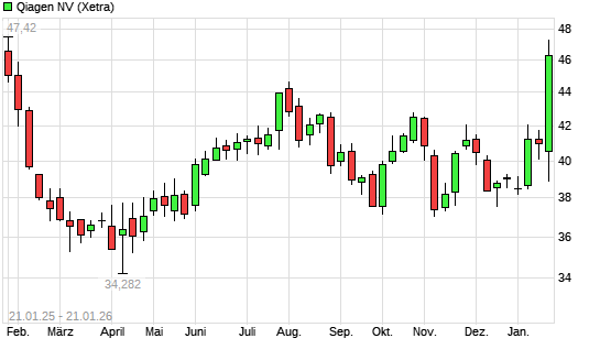 Mit dem Anstieg auf 47,70 EUR hat die Qiagen-Aktie (ISIN NL0015002SN0) am 20.01.2026 ein neues 3-Jahres-Hoch erreicht und damit den Kurs vom 08.02.2023 eingestellt.