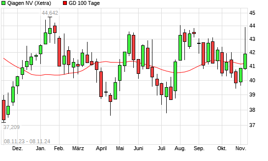 Mit dem Anstieg auf 41,27 EUR hat die Qiagen-Aktie am 07.11.2024 die 100-Tage-Linie nach oben gekreuzt.