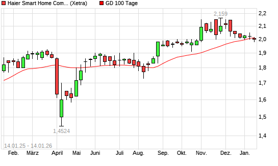 Mit dem Anstieg auf 2,01 EUR hat die Qingdao Haier-Aktie am 13.01.2026 die 100-Tage-Linie nach oben gekreuzt.Die Qingdao Haier-Aktie befindet sich seit dem 18.08.2025 im ...weiterlesen