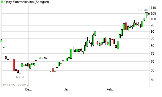 Mit dem Anstieg auf 103,92 EUR hat die Qnity Electronics-Aktie (ISIN US74743L1008) am 26.02.2026 ein neues All-Time-High erreicht und damit den Kurs vom 24.02.2026 eingestellt.