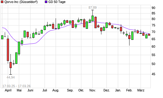 Mit dem Rücksetzer auf 67,68 EUR hat die Qorvo-Aktie am 16.03.2026 die 50-Tage-Linie nach unten gekreuzt.