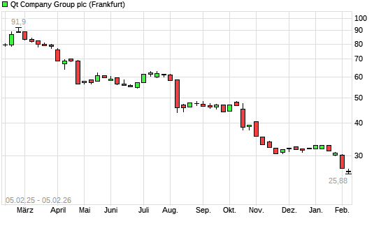 Mit dem Rücksetzer auf 25,88 EUR hat die Qt Group Ord Shs-Aktie (ISIN FI4000198031) am 04.02.2026 ein neues 5-Jahres-Tief erreicht und damit den Kurs vom 02.02.2026 eingestellt.
