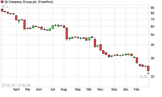 Mit dem Rücksetzer auf 21,52 EUR hat die Qt Group Ord Shs-Aktie (ISIN FI4000198031) am 26.02.2026 ein neues 5-Jahres-Tief erreicht und damit den Kurs vom 17.02.2026 eingestellt.
