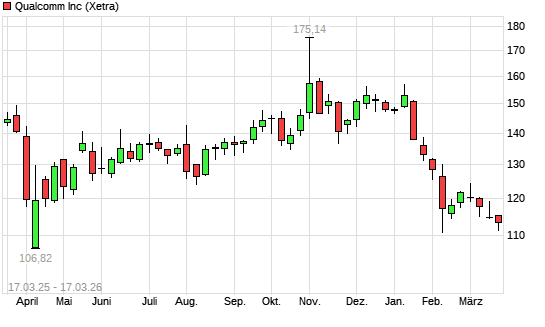 Mit dem Rücksetzer auf 112,18 EUR hat die Qualcomm-Aktie (ISIN US7475251036) am 16.03.2026 ein neues 6-Monats-Tief erreicht und damit den Kurs vom 13.03.2026 eingestellt.